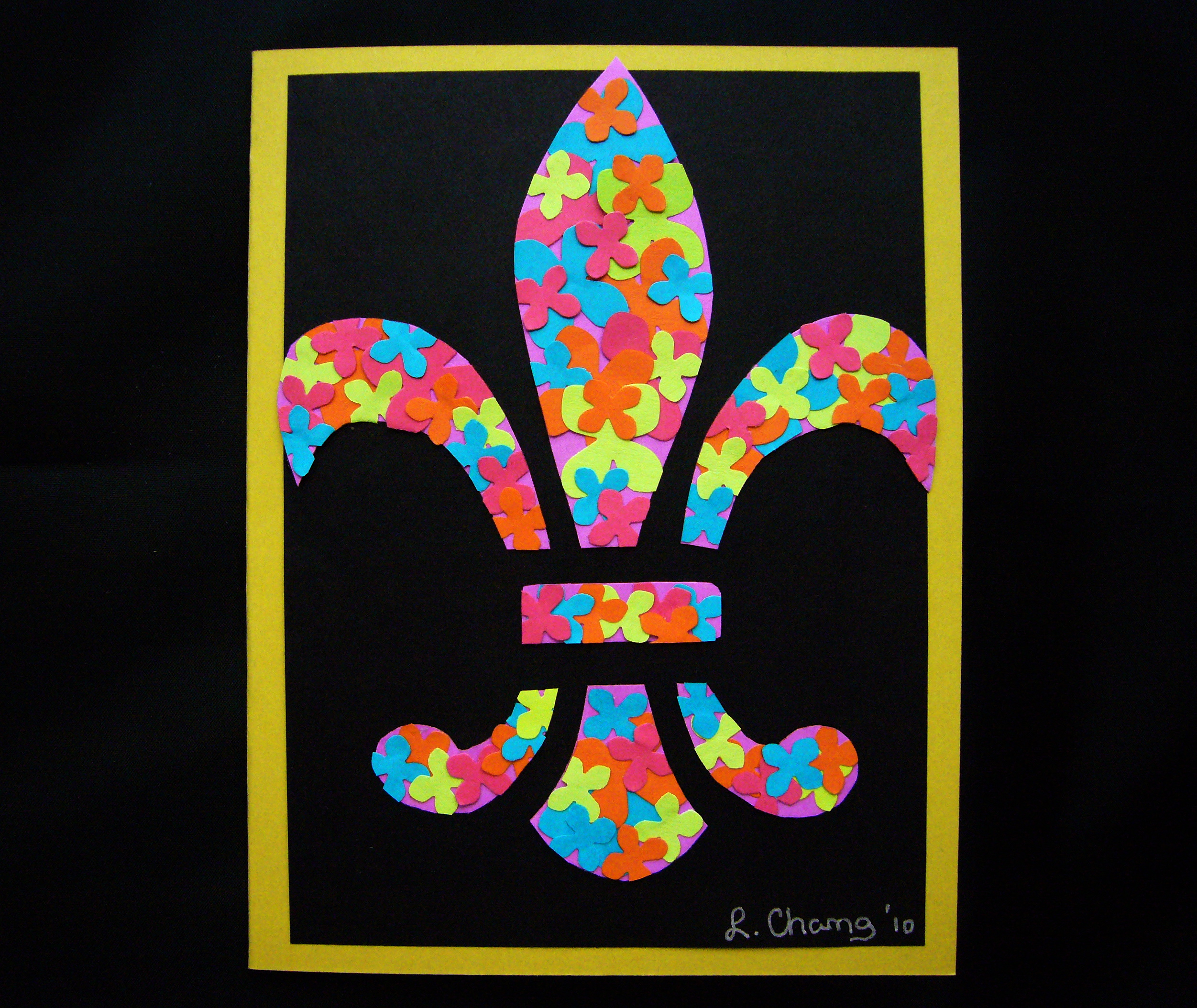 Being a flower child of the ’70s, I decided to make birthday cards for my sister-in-law and for a friend utilizing paper punches and scraps again, but this time designing them to be in the shape of peace signs. The heart-shaped peace sign was made by stacking large and small, flower-shaped punch-outs from Astrobright paper. The round traditional peace sign consisted of stars punched out of an outdated Hawaiian calender, then color grouped and mounted onto pearlized cream and lustrous aquamarine papers.